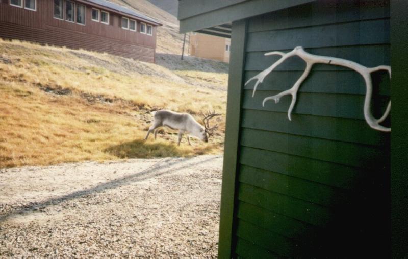 Ein Svalbardrentier in der Stadt an Weg 224/7. Die Rentiere auf Spitzbergen sind zwar wilde Tiere, aber sie kennen den Menschen nicht als Feind. So laufen sie auch in der Stadt herum und haben vor den Menschen keine Angst. |